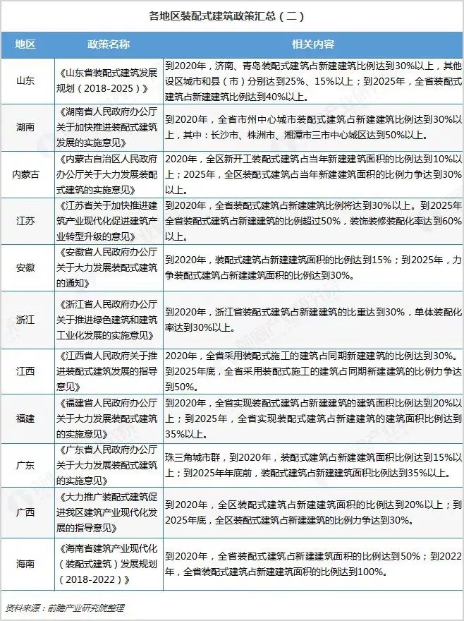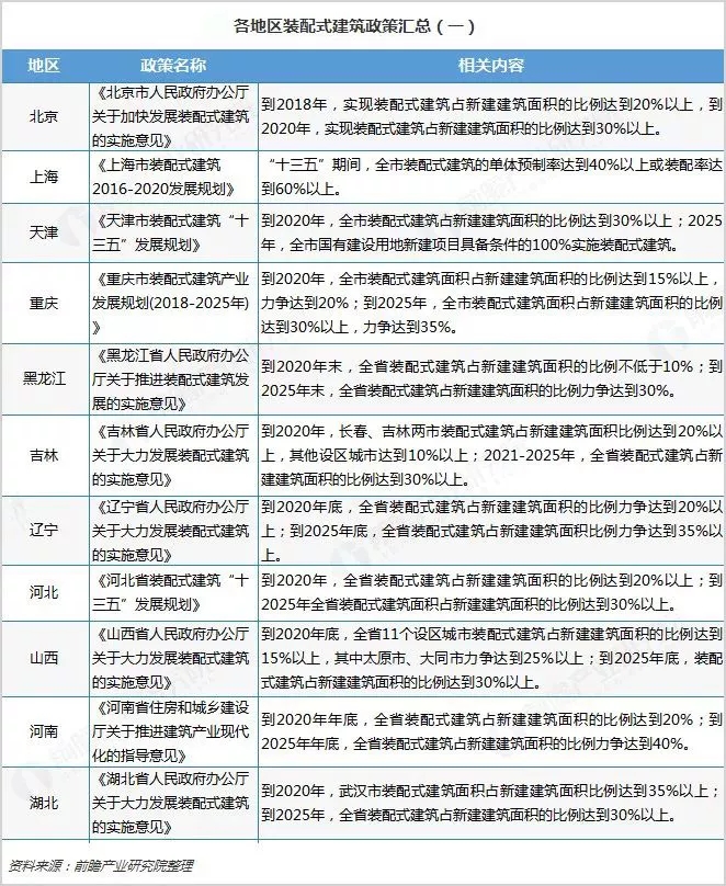 目前我國(guó)31個(gè)省市、自治區(qū)都已經(jīng)制定了裝配式建筑發(fā)展規(guī)劃,其中北京、天津、浙江等地提出,到2020年實(shí)現(xiàn)裝配式建筑占新建建筑面積的比例達(dá)到30%以上,高于全國(guó)目標(biāo);而海南省提出在2020年裝配式建筑占比達(dá)到50%。